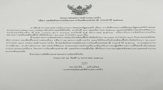 ชื่อเรื่อง : ประกาศงดจัดงานวันเด็กแห่งชาติ ประจำปี 2564