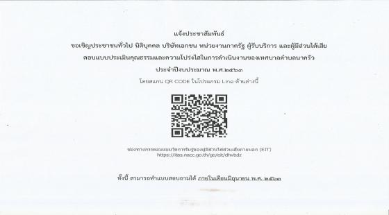 ชื่อเรื่อง : แจ้งประชาสัมพันธ์ นิติบุคคล บริษัทเอกชน หน่วยงานภาครัฐ ผู้รับบริการ และผู้มีส่วนได้เสีย ตอบแบบประเมินคุณธรรมและความโปร่งใสในการดำเนินงานของเทศบาลตำบลนาครัว ประจำปีงบประมาณ พ.ศ. 2563 โดยการสแกน QR CODE ทั้งนี้ สมารถทำแบบสอบถามได้ ภายในเดือน มิถุนายน 2563