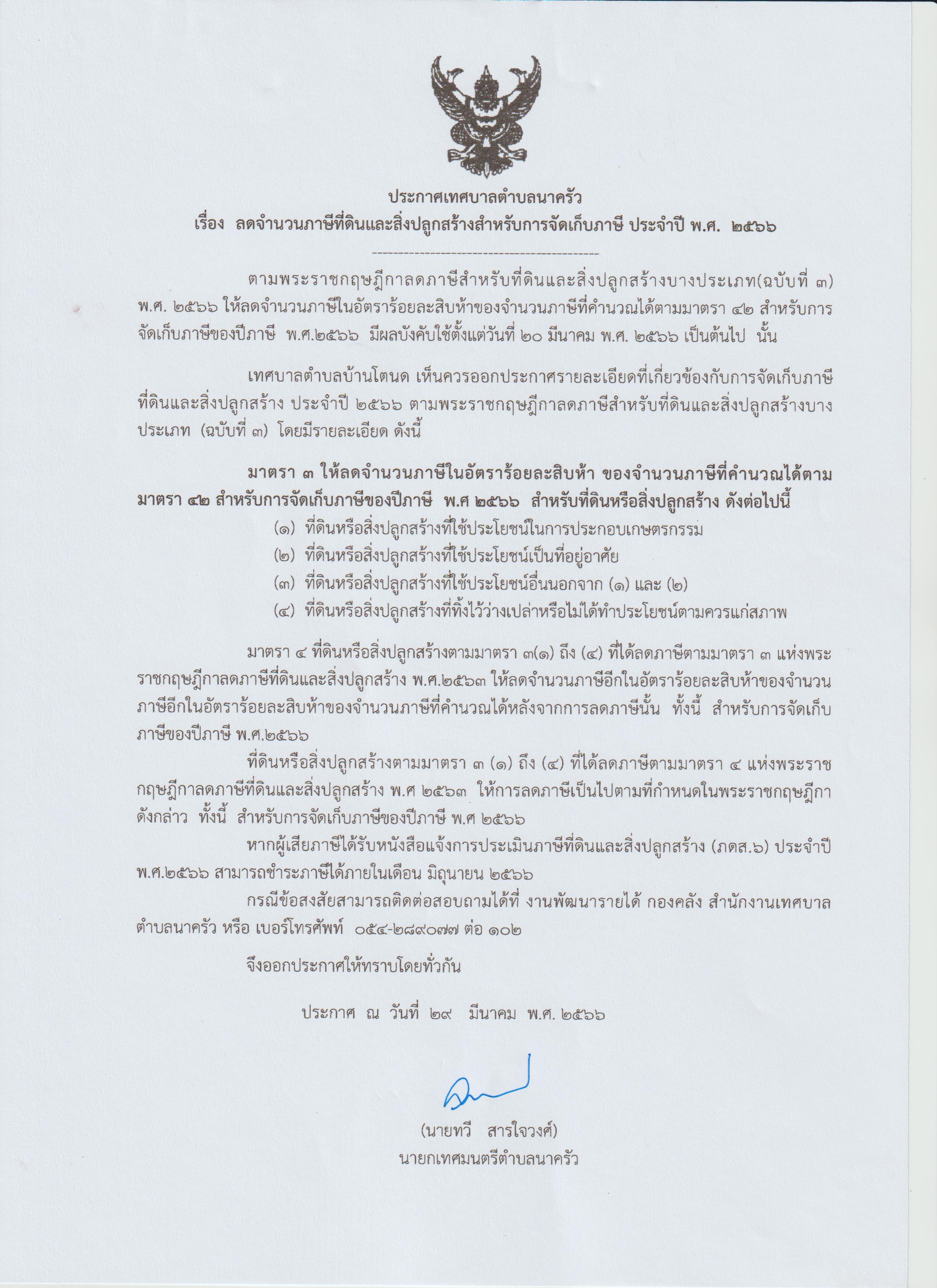 ประกาศลดจำนวนภาษีที่ดินและสิ่งปลูกสร้างสำหรับการจัดเก็บภาษี ประจำปี พ.ศ.2566